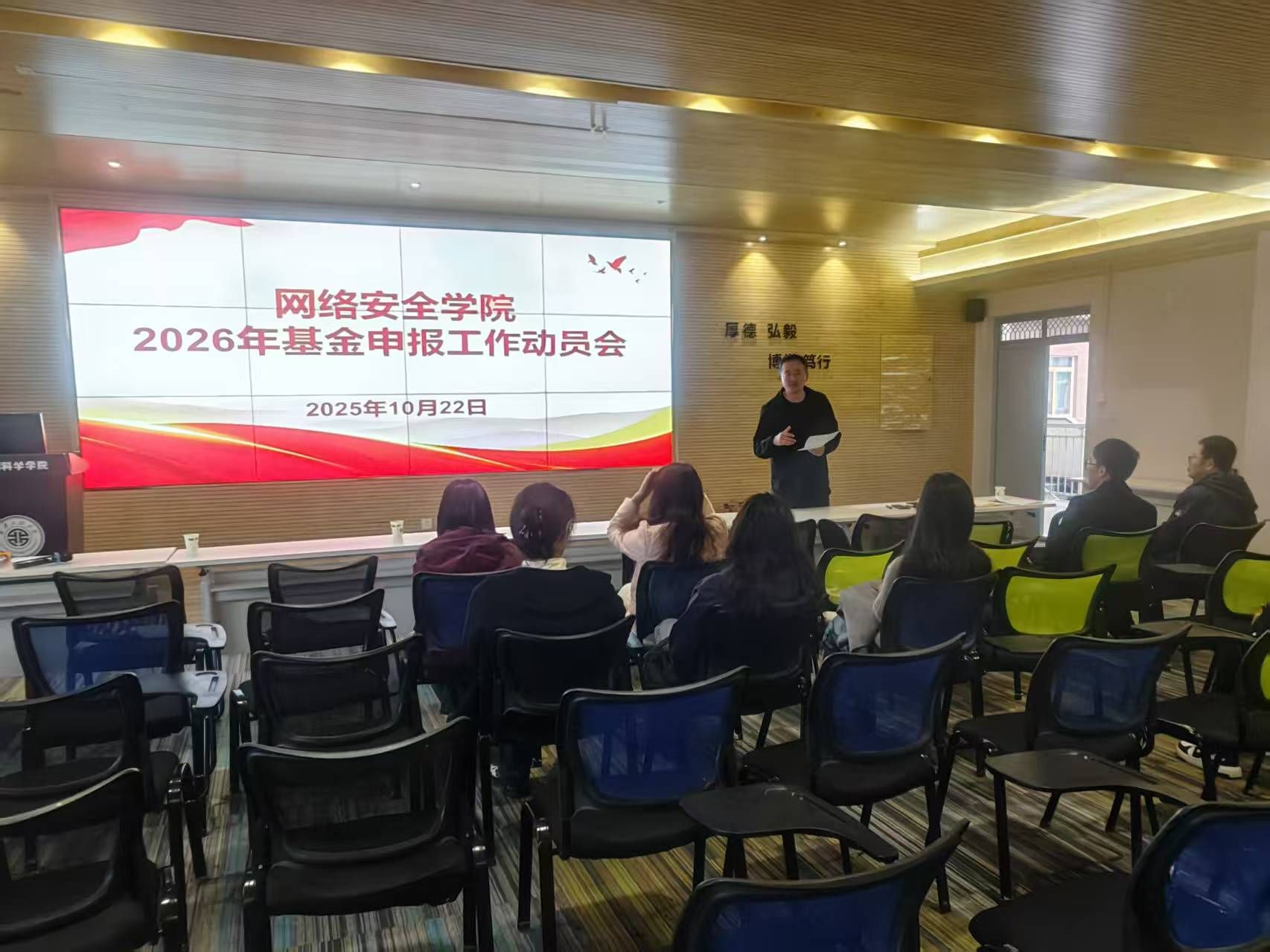 10月22日下午,网络安全学院在笃行楼614会议室召开2026年度国家自然科学基金申报动员会。学院常务副院长刘枫、党总支副书记刘蓉以及学术骨干和青年科研人员参加会议。