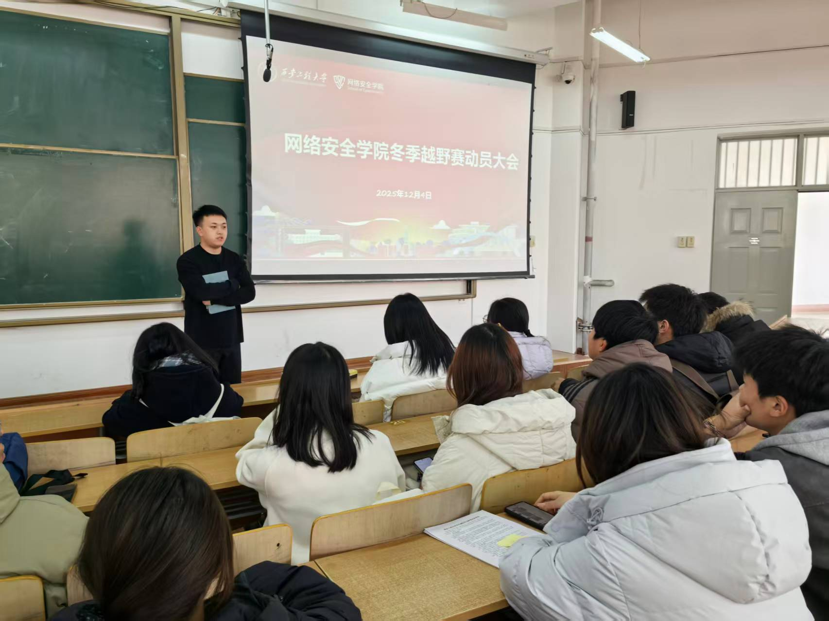 学院学工办副主任贾天昱在会上强调了"安全第一"的参赛原则,详细讲解了越野赛的路线规划、注意事项及应急保障措施,他鼓励全体学生积极报名参与,通过赛事感受运动魅力,锤炼坚韧意志。2025级辅导员白江龙表示,冬季越野赛不仅是一场体能的比拼,更是展现网安学子凝聚力与向心力的重要平台,希望同学们在比赛中相互扶持、奋勇争先,充分彰显网安学子的自信风采。会上还对上一届越野赛表现优异的12名同学进行表彰。