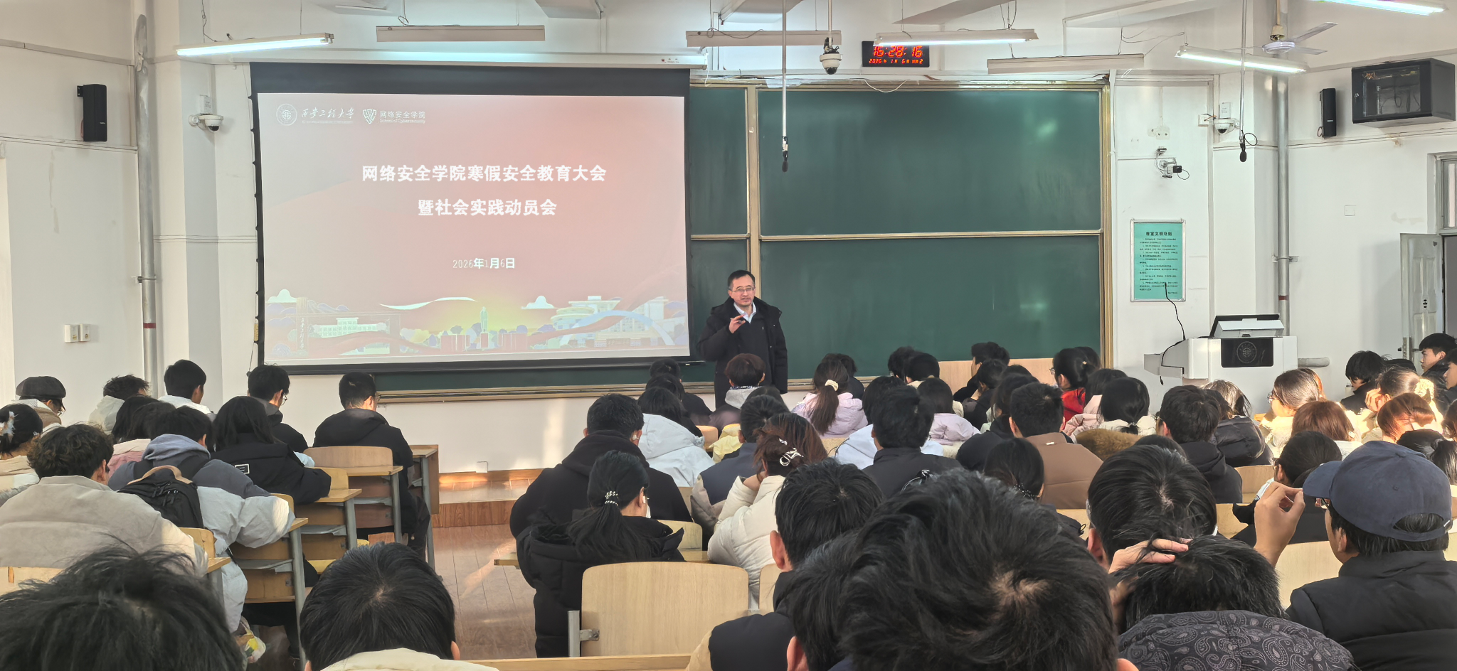 为统筹推进假期社会实践、安全保障与学业提升各项工作,引导学生在寒假期间锤炼专业本领、严守安全底线、实现学有所获,1月6日,网络安全学院召开寒假安全教育大会暨社会实践动员会。学院常务副院长刘枫、党总支副书记刘蓉、团委副书记曹子凡出席会议,2024级、2025级全体学生参加,大会由2025级辅导员白江龙主持。
