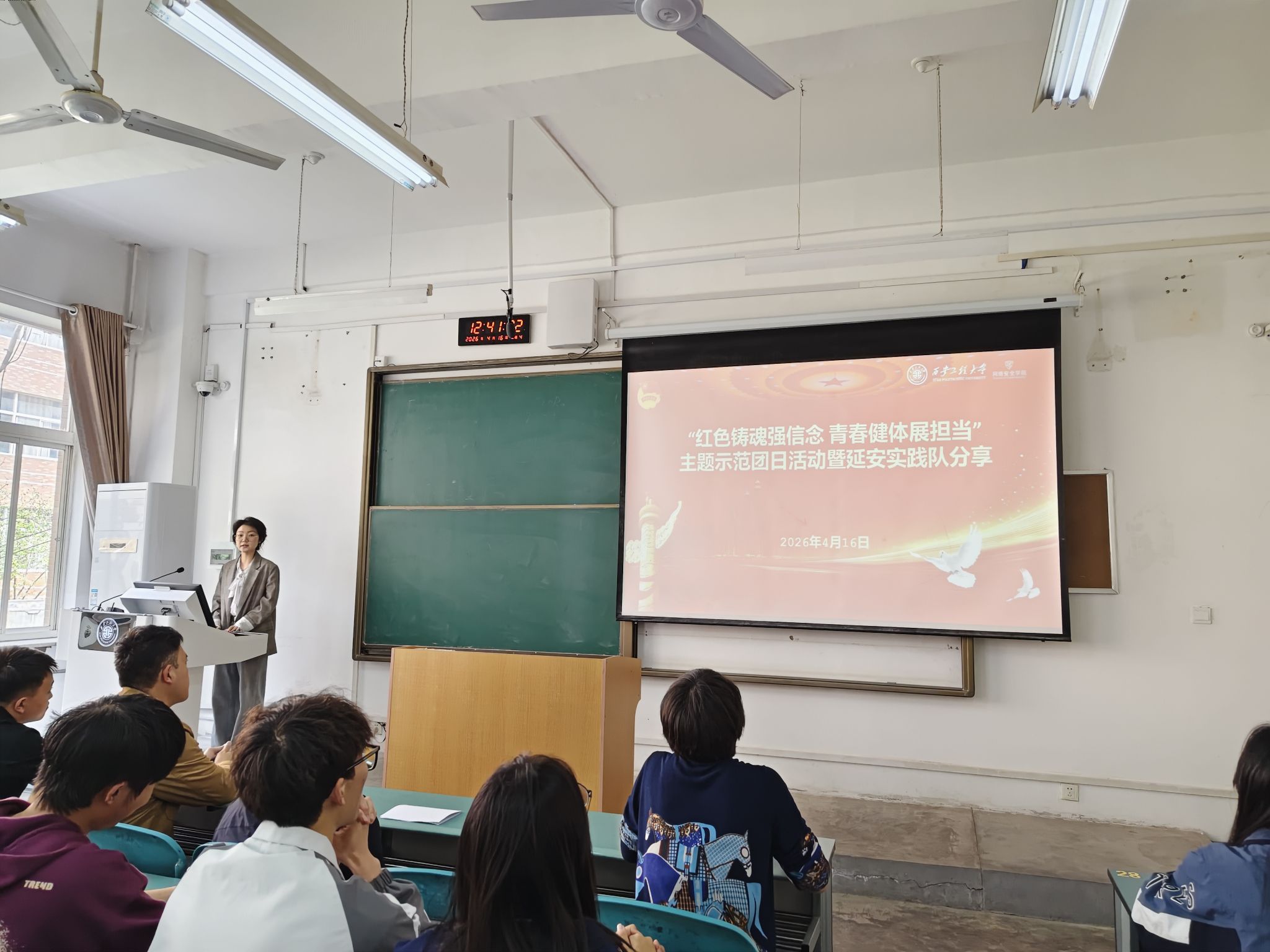 随后,网安2503班张婧羽代表2026年寒假社会实践延安队做“到延安去——踏红色足迹 铸网安担当”主题分享。她围绕“所见、所悟、所系、所行、所向”五个维度,以图文并茂方式带领青年重温延安艰苦岁月与先辈奋斗精神,号召学生提升网络攻防能力,诠释新时代网安青年传承延安精神、践行使命担当的初心。